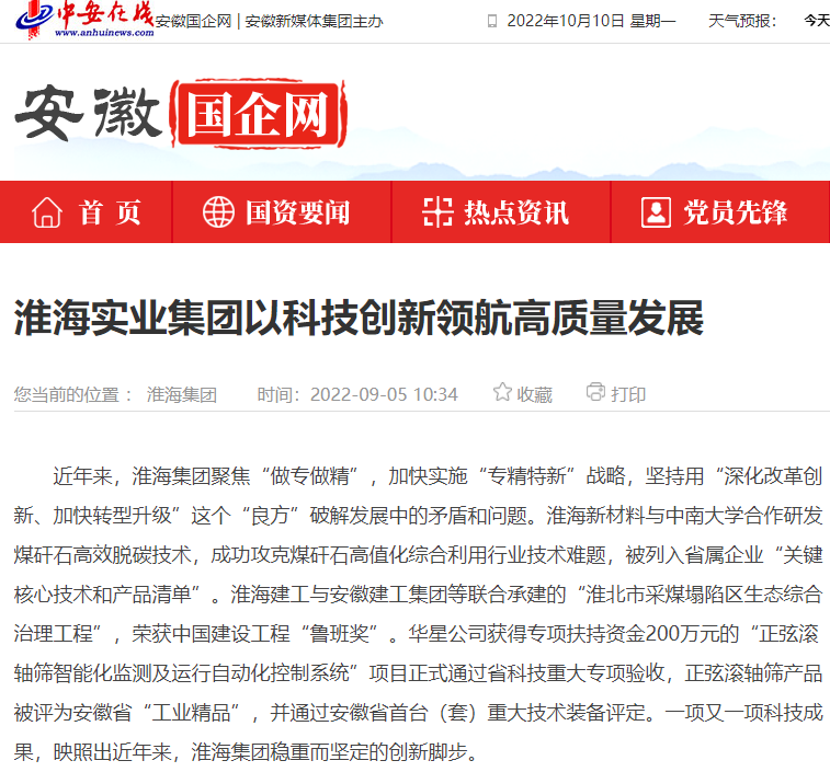 近年來,淮海集團聚焦“做專做精”,加快實施“專精特新”戰略,堅持用“深化改革創新、加快轉型升級”這個“良方”破解發展中的矛盾和問題。淮海新材料與中南大學合作研發煤矸石高效脫碳技術,成功攻克煤矸石高值化綜合利用行業技術難題,被列入省屬企業“關鍵核心技術和產品清單”。淮海建工與安徽建工集團等聯合承建的“淮北市采煤塌陷區生態綜合治理工程”,榮獲中國建設工程“魯班獎”。華星公司獲得專項扶持資金200萬元的“正弦滾軸篩智能化監測及運行自動化控制系統”項目正式通過省科技重大專項驗收,正弦滾軸篩產品被評為安徽省“工業精品”,并通過安徽省首臺(套)重大技術裝備評定。一項又一項科技成果,映照出近年來,淮海集團穩重而堅定的創新腳步。