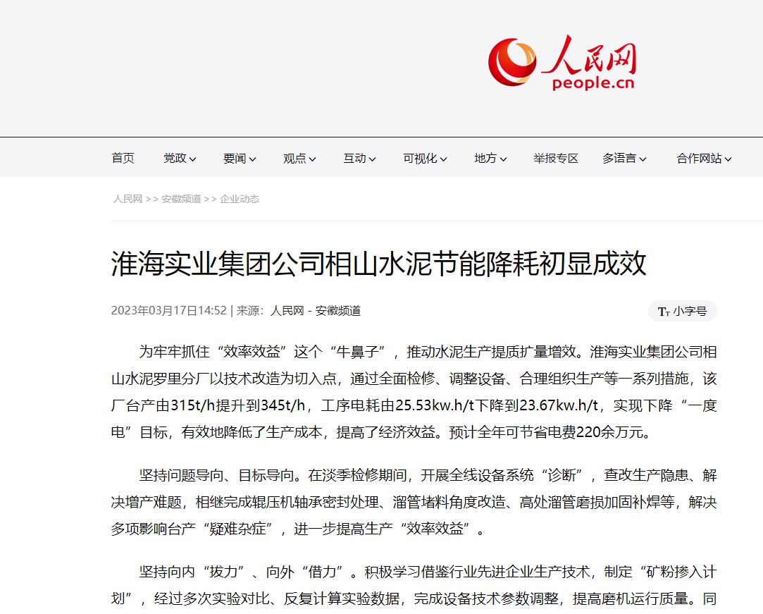 為牢牢抓住“效率效益”這個(gè)“牛鼻子”,推動(dòng)水泥生產(chǎn)提質(zhì)擴(kuò)量增效。淮海實(shí)業(yè)集團(tuán)公司相山水泥羅里分廠(chǎng)以技術(shù)改造為切入點(diǎn),通過(guò)全面檢修、調(diào)整設(shè)備、合理組織生產(chǎn)等一系列措施,該廠(chǎng)臺(tái)產(chǎn)由315t/h提升到345t/h,工序電耗由25.53kw.h/t下降到23.67kw.h/t,實(shí)現(xiàn)下降“一度電”目標(biāo),有效地降低了生產(chǎn)成本,提高了經(jīng)濟(jì)效益。預(yù)計(jì)全年可節(jié)省電費(fèi)220余萬(wàn)元。